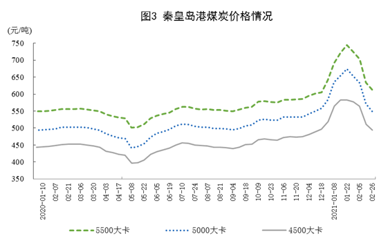 港口煤炭綜合交易價(jià)格高位回落。2月26日秦皇島港5500、5000和4500大卡煤炭?jī)r(jià)格分別為每噸613元、550元和494元,比1月22日最高價(jià)分別下降132元、124元和89元。
