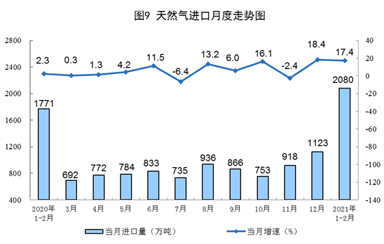 天然氣生產(chǎn)同比較快增長(zhǎng),日均環(huán)比保持穩(wěn)定。1—2月份,生產(chǎn)天然氣348億立方米,同比增長(zhǎng)13.5%,比2019年1—2月份增長(zhǎng)22.5%,兩年平均增長(zhǎng)10.7%;日均產(chǎn)量5.9億立方米,比上年12月份減少0.1億立方米。進(jìn)口天然氣2080萬(wàn)噸,同比增長(zhǎng)17.4%。