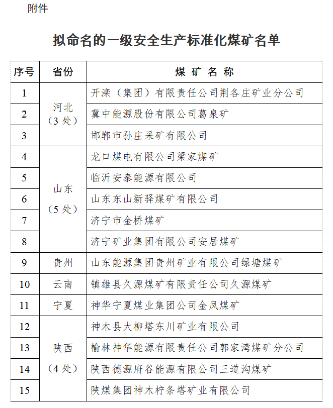 國家煤礦安監(jiān)局公示擬命名一級(jí)安全生產(chǎn)標(biāo)準(zhǔn)化煤礦共15處