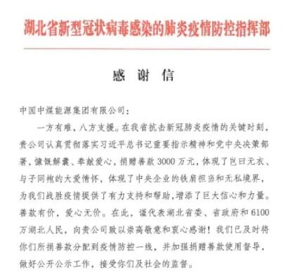 湖北省疫情防控指揮部、湖北省慈善總會致中煤集團感謝信