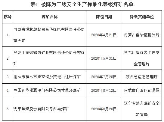 按照《煤礦安全生產(chǎn)標(biāo)準(zhǔn)化管理體系考核定級(jí)辦法(試行)》(煤安監(jiān)行管〔2020〕16號(hào))有關(guān)規(guī)定,內(nèi)蒙古錫林郭勒白音華煤電有限責(zé)任公司露天礦等5處煤礦一級(jí)安全生產(chǎn)標(biāo)準(zhǔn)化等級(jí)被降為三級(jí),詳見(jiàn)附表1。