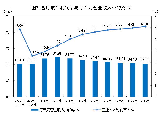 1—11月份,規(guī)模以上工業(yè)企業(yè)每百元營業(yè)收入中的成本為84.08元,同比減少0.01元;每百元營業(yè)收入中的費(fèi)用為8.92元,同比增加0.12元。