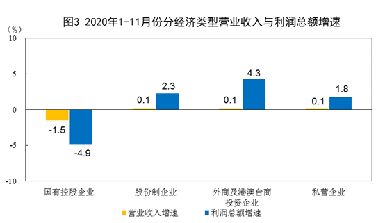 1—11月份,規(guī)模以上工業(yè)企業(yè)中,國有控股企業(yè)實現(xiàn)利潤總額14456.9億元,同比下降4.9%;股份制企業(yè)實現(xiàn)利潤總額40580.1億元,增長2.3%;外商及港澳臺商投資企業(yè)實現(xiàn)利潤總額16105.2億元,增長4.3%;私營企業(yè)實現(xiàn)利潤總額17332.2億元,增長1.8%。