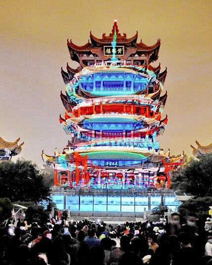 △10月7日晚,來自全國各地的抗疫英雄、游客及武漢市民在黃鶴樓前觀看大型實(shí)景光影秀《夜上黃鶴樓》