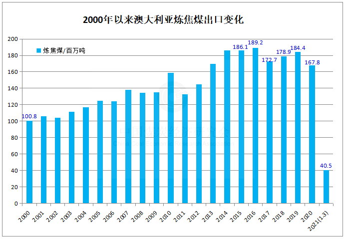 2021年一季度澳大利亞煉焦煤出口同比下降5%