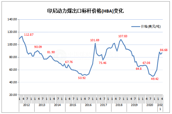 據(jù)印度尼西亞能源與礦產(chǎn)資源部(Indonesia's Ministry of Energy and Mineral Resources)發(fā)布的信息, 2021年4月份印尼動力煤參考價(Indonesian Coal Price Reference ,HBA)確定為86.68美元/噸,環(huán)比提高2.19美元/噸,上升2.59%;同比增加20.91美元/噸…